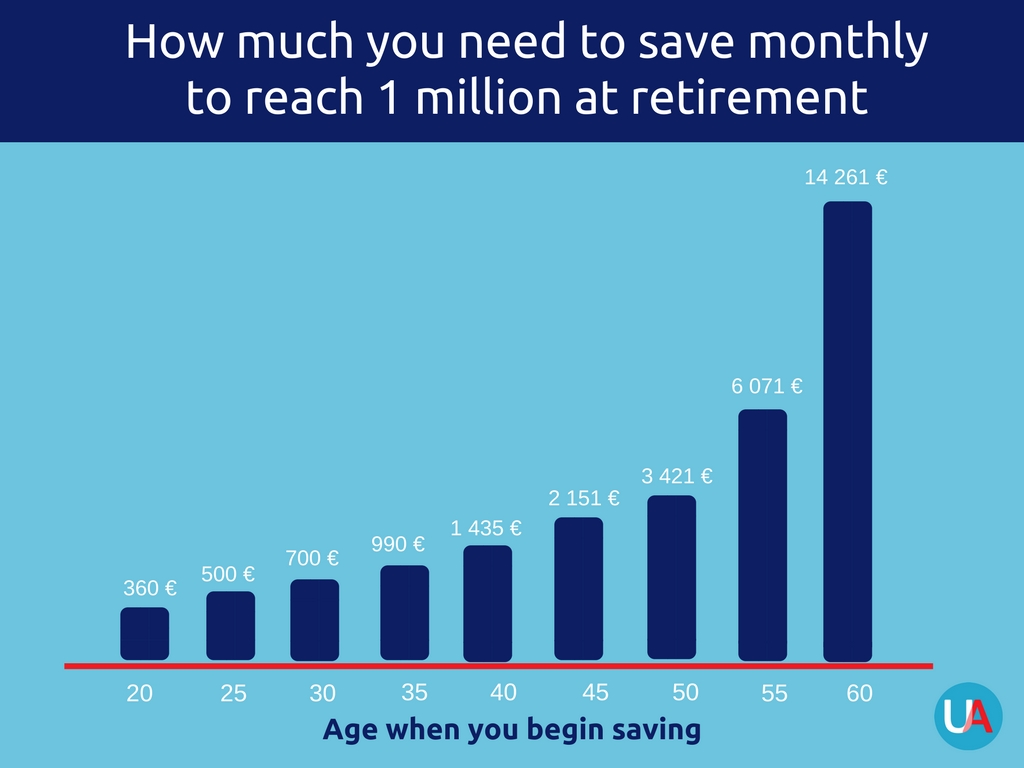 As you can see from the above chart, to reach €1 million euros in savings, which generates approximately a €40,000 pa revenue, you’d only have to contribute €700 per month of savings at age 30, however, this increases rapidly should you start saving later in life.